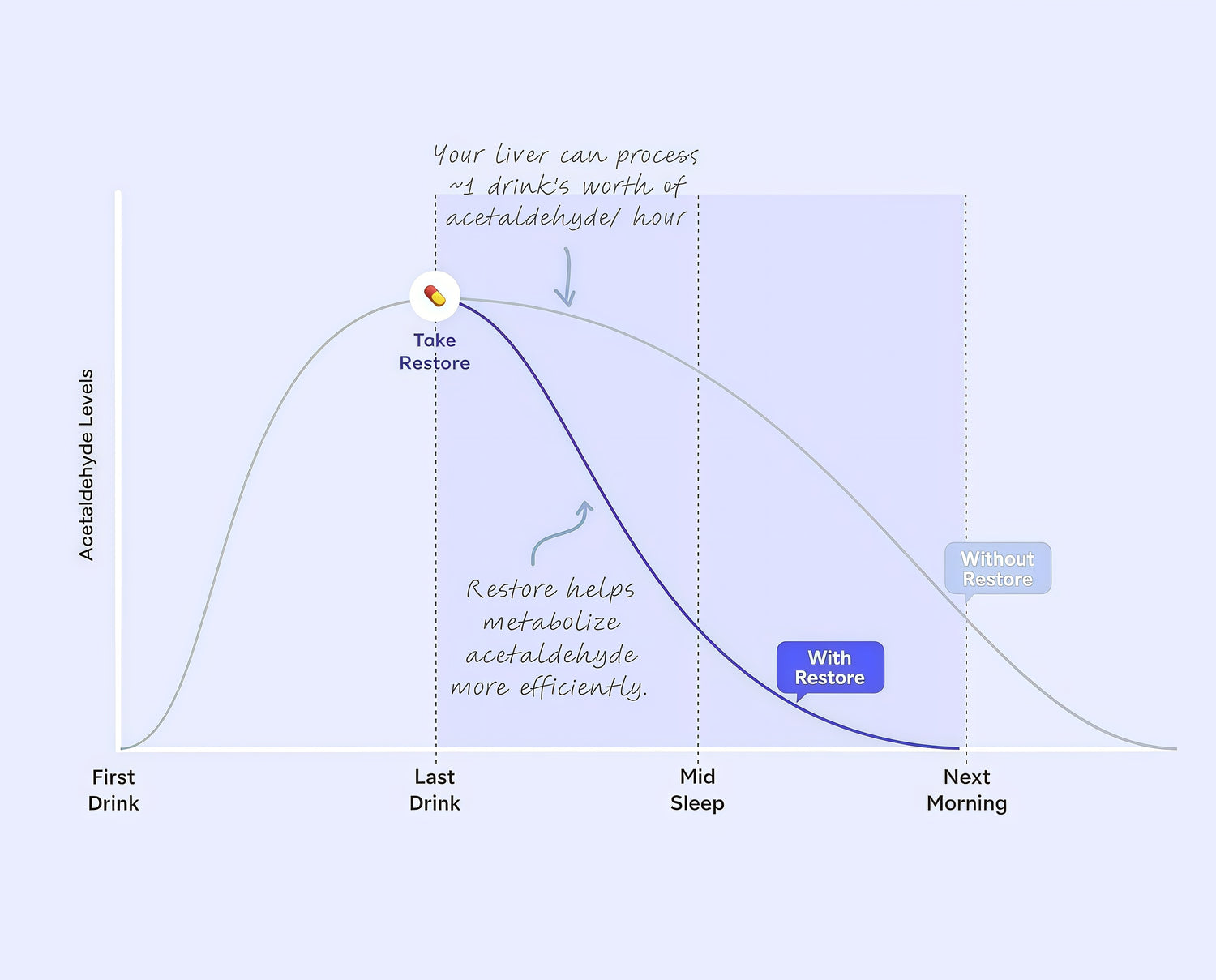 To metabolize alcohol, your body must first convertalcohol into acetaldehyde (20x more toxic thanalcohol itself) before clearing it from your system.Restore reduces the time you're exposed toacetaldehyde, helping to speed up themetabolization process