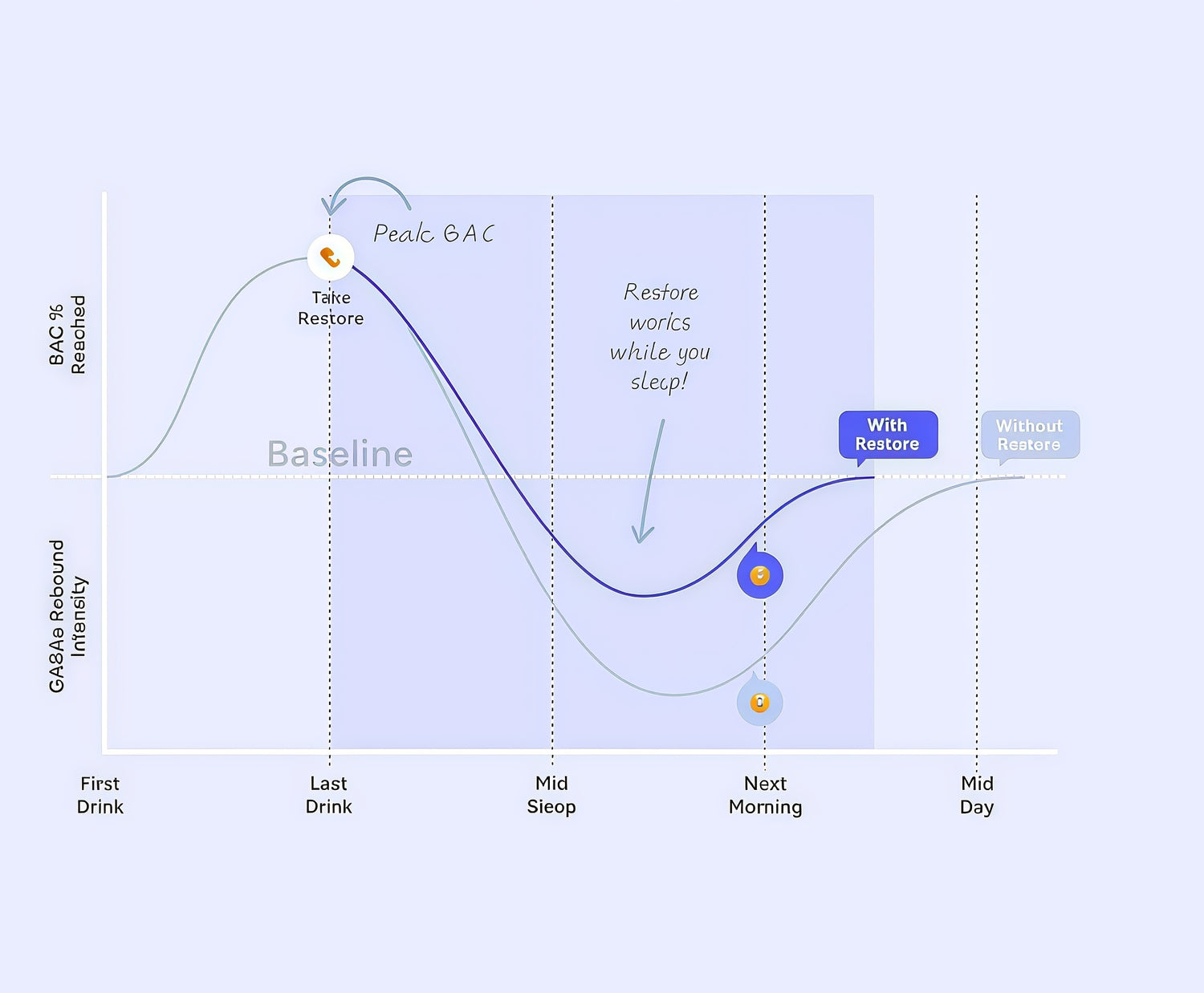 Restore is the most effective when taken closest to your last drink as possible. The DHM in Restore binds to the sameneurotransmiters (the GABA receptors) that alcohol binds to. Restore is designed to help you process alcohol faster so thatyou wake up feeling less of those negative efects, which is why it's important that alcohol is stilin your system when you takeour product.