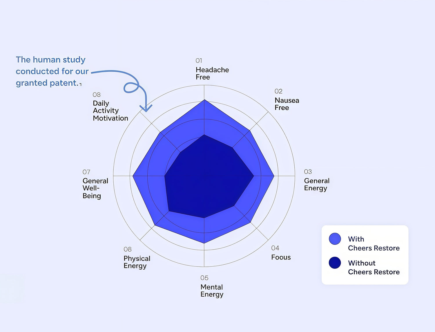 In a human study conducted for our granted patent, users of Cheers Restore felt an average of 50%+ better the next day across 8 typical effects1.